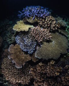 A vibrant coral reef flourishes beneath clear blue waters, bursting with shades of pink, orange, and purple. Delicate coral formations spread across the ocean floor like an underwater garden, alive with intricate textures and quiet movement. Above this fragile ecosystem, a vast shadow stretches downward, dimming the sunlight and casting an air of uncertainty over the scene. The contrast between radiant life below and the looming darkness above captures the delicate balance of marine environments beautiful, resilient, yet vulnerable to forces beyond their control