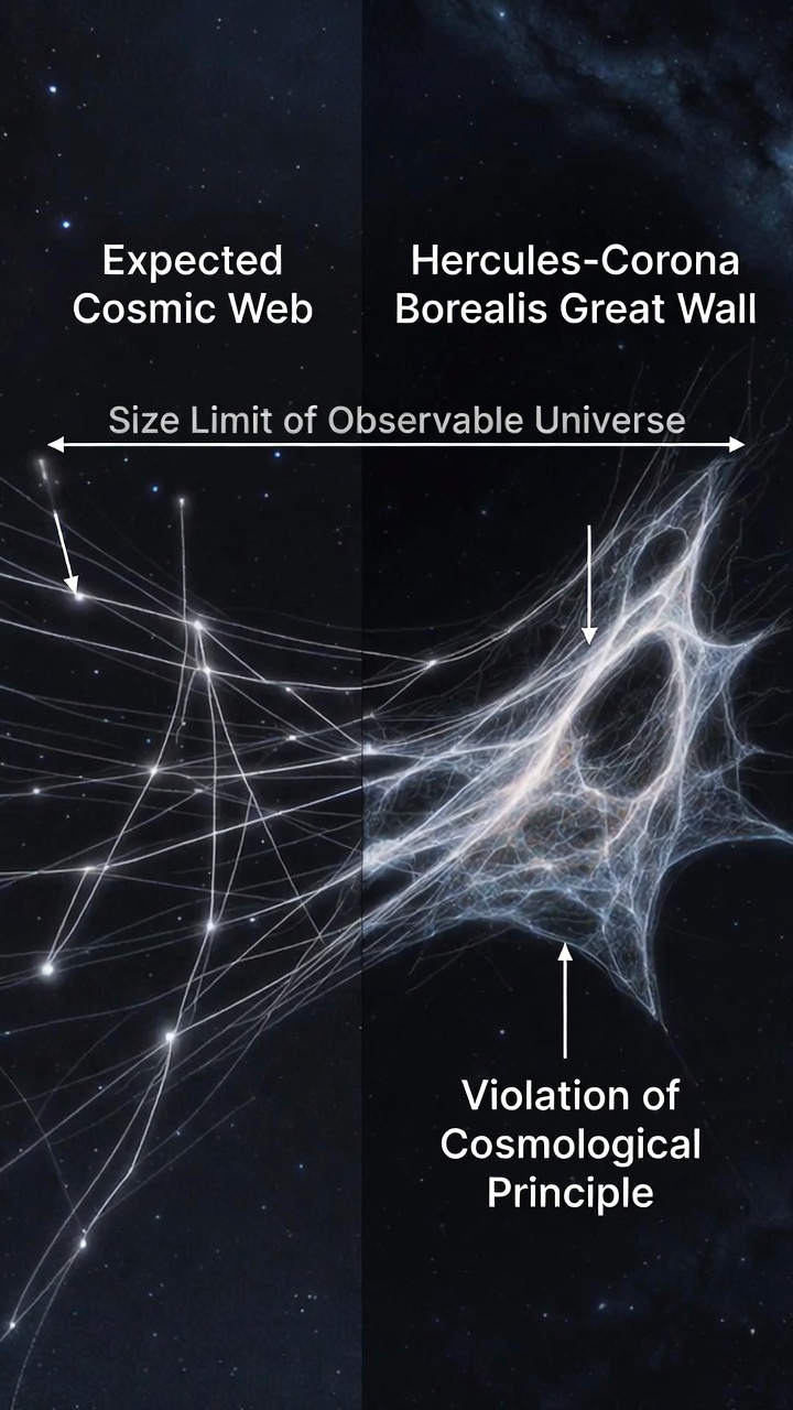 This wall—10–15 times larger violates that limit, implying extreme deviations or rare fluctuations. If real, it questions how matter clumped so massively post-Big Bang, perhaps requiring tweaks to dark matter, inflation, or gravity models.