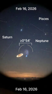 This marks the third and tightest meeting in a series that began in 2025: first on June 29 (separation ~0°59′), second August 6 (~1°09′), and now this February 16 event at ~0°54′ separation (exact right ascension alignment at 03:38 UTC / 03:38 GMT). The planets continue closing to a minimum ~0°49′ by February 20, but tonight delivers peak excitement for evening viewers. Saturn, shining brightly at magnitude ~1.0 as a steady golden “star,” guides the way; faint Neptune at magnitude 7.9 appears as a tiny bluish dot nearby requiring binoculars or a small telescope to spot. In the constellation Pisces, low in the southwest shortly after sunset, the pair hovers ~32° from the Sun, setting within a couple hours. This once-in-a-lifetime closeness (in this triple setup) highlights the outer planets’ slow orbital dance Saturn circles every 29 years, Neptune every 165 creating such alignments roughly every 36 years, but triple ones add extra rarity. Grab binoculars, find a clear western horizon, and join the cosmic watch party who’s heading out to spot them?