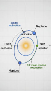 Pluto’s orbit is wildly eccentric (e = 0.25), ranging from 30 to 49 AU, sometimes closer to the Sun than Neptune (as it was from 1979–1999). Its 17° inclination tilts sharply relative to the ecliptic plane, and its 248-year orbit is locked in a 3:2 resonance with Neptune.