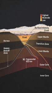 Deep-focus quakes occur within sub ducting slabs of oceanic lithosphere that have sunk into the mantle after being consumed at convergent plate boundaries. In Southeast Asia, the complex interplay of the Sunda Trench subduction zone (where the Indo-Australian Plate dives beneath the Eurasian Plate) and regional microplates drives such activity. The slab beneath northern Borneo remains cold and brittle enough to fracture violently even at great depths, releasing energy in a sudden snap.