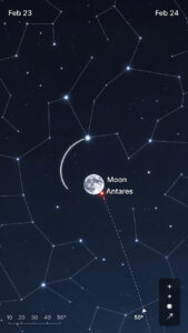 The Moon orbits Earth every 27.3 days, moving roughly 13° eastward against the background stars each day. On February 23–24, it crosses into Scorpius during its waxing gibbous phase (~70–80% illuminated), passing close to Antares in the constellation’s distinctive “J” shape.