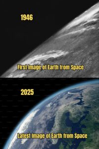 The image presents a striking side‑by‑side comparison of the first ever photograph of Earth taken from space (1946) and the latest high‑resolution image of our planet captured in 2025. The top half shows a grainy, black‑and‑white snapshot that marked humanity’s initial glimpse of Earth from beyond the atmosphere. The bottom half displays a vivid, detailed color photograph showcasing modern imaging technology, highlighting continents, oceans, cloud patterns, and atmospheric effects with exceptional clarity