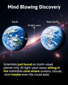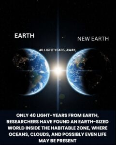 The image illustrates a newly discovered Earth‑sized planet located just 40 light‑years from our own Earth. The planet sits within its star’s habitable zone, the region where conditions may allow liquid water, oceans, and clouds to exist, raising the exciting possibility that life could thrive there