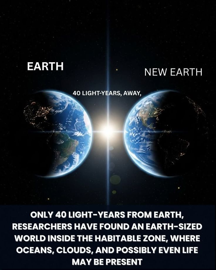 The image illustrates a recent astronomical find of a planet roughly the size of Earth located just 40 light‑years from our planet. This “new Earth” sits within its star’s habitable zone, the region where conditions could allow liquid water, clouds, and possibly even life to exist